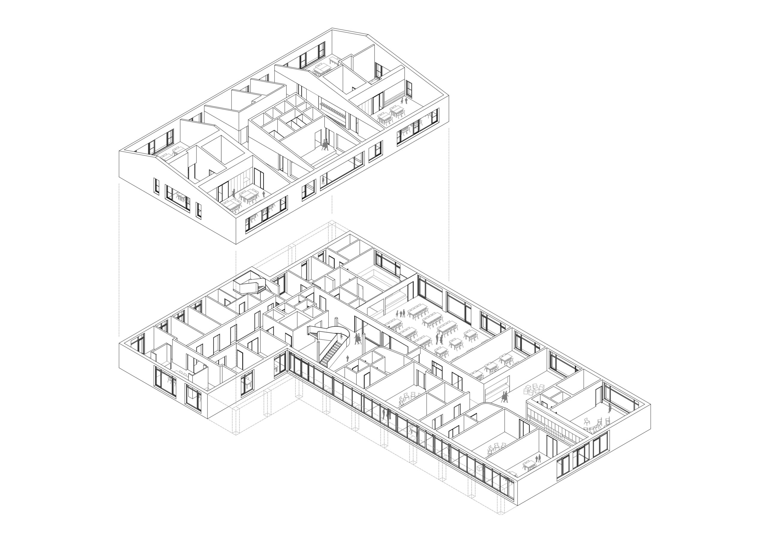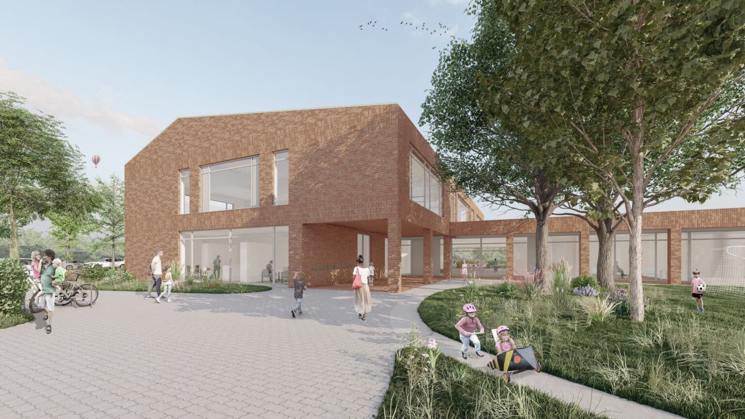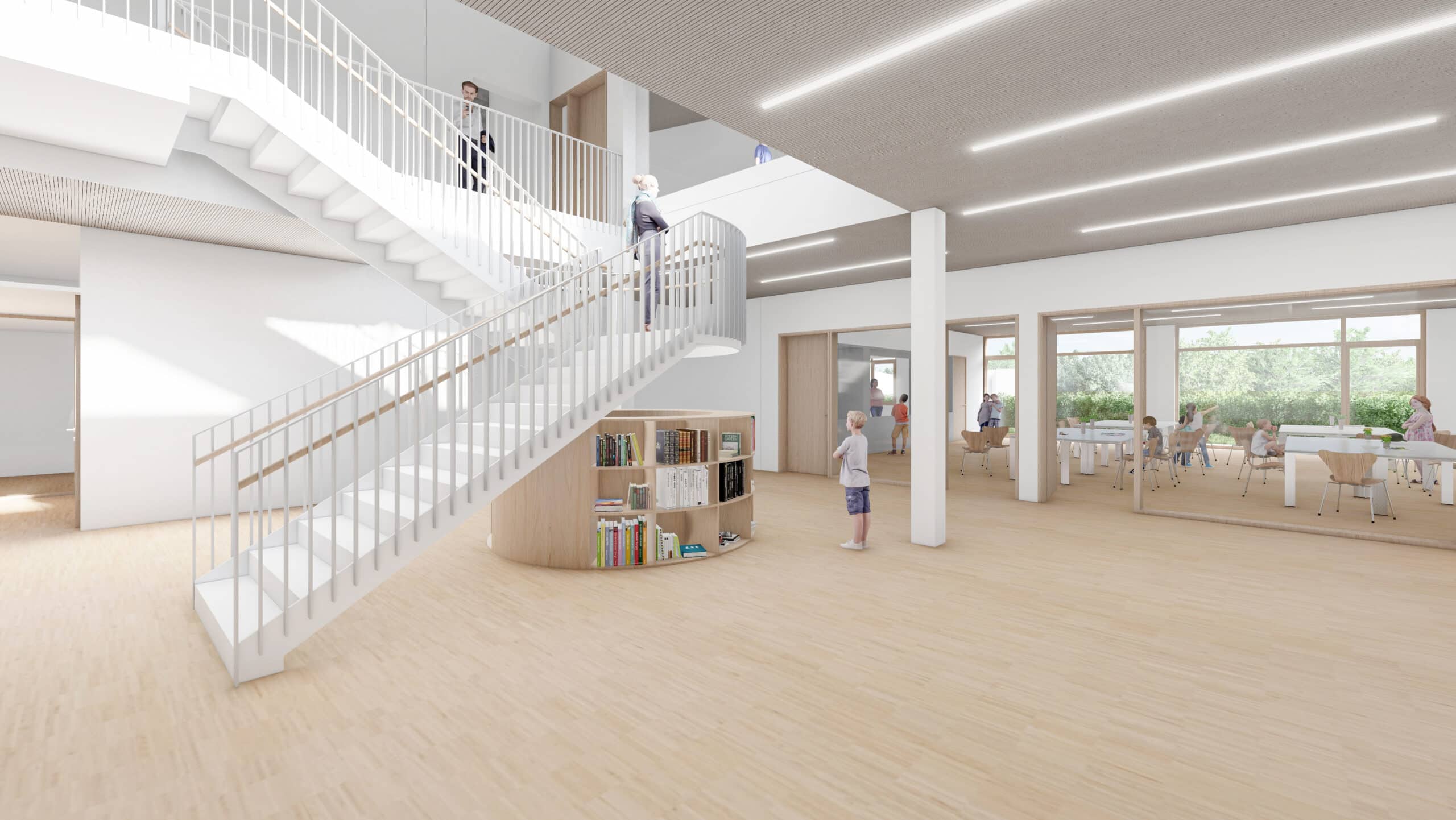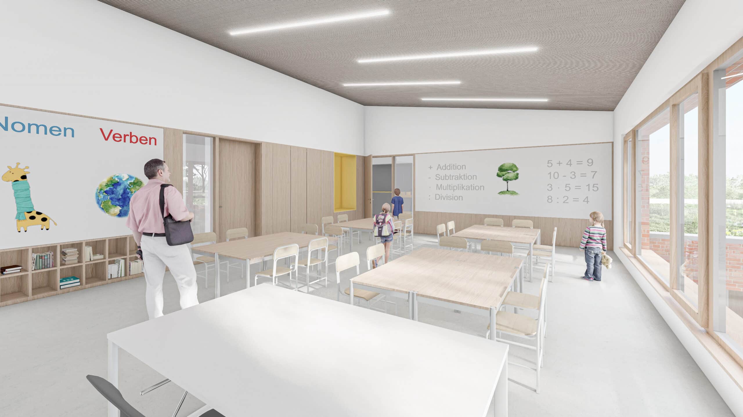Der Neubaukörper orientiert sich an der L-förmigen Gestalt der Bestandsbebauung. Westlich umfasst das Gebäude den Schulhof, dem durch die Öffnung zur Dorfstraße der Dorfplatzcharakter erhalten bleibt. Nördlich betont der zweigeschossige Gebäudeteil den Haupteingang. Der südliche eingeschossige Baukörper wird in Richtung Schulhof von einem offenen Gang mit außenliegender Stützenreihe begleitet. Die überdachten Bereiche dienen der natürlichen Verschattung und dem Witterungsschutz. Sie können für Regenpausen als auch für Veranstaltungen auf dem Dorfplatz genutzt werden. Die Positionierung des ruhenden Verkehrs erfolgt in direkter Zuordnung zur Zutrittssituation. Östlich des Gebäudes befindet sich eine optionale Erweiterungsfläche, für die Nutzungen wie ein grünes Klassenzimmer, eine Außenwerkstatt und ein Schulgarten denkbar sind.