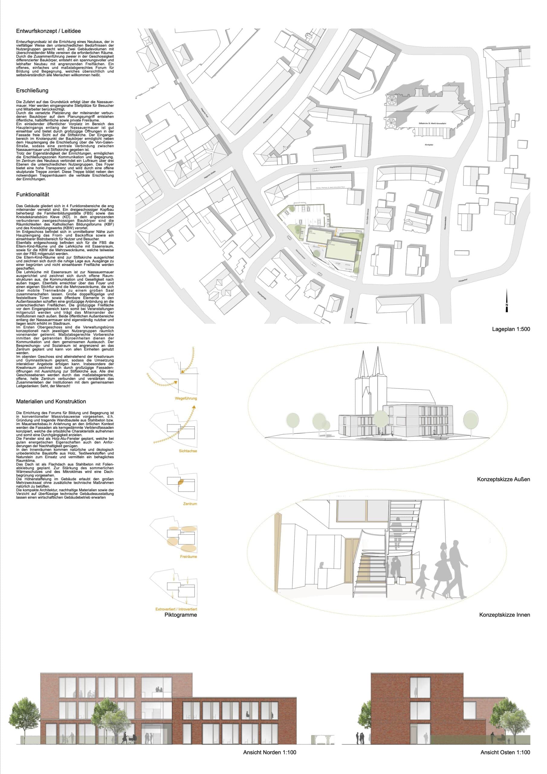 Der Neubau für das katholische Forum für Bildung und Begegnung befindet sich in unmittelbarer Nähe zur Stiftskirche St. Mariä Himmelfahrt an der Kreuzung Nassauermauer/ Von-Galen-Straße/ Weyerstege. Die attraktive und zentrale Lage soll zukünftig als Anlaufpunkt für alle Altersklassen dienen. Der Haupteingang ist durch die Wegeführung von der Nassauermauer aus, die Vorplatzsituation und die Ablesbarkeit in der Fassade klar definiert.