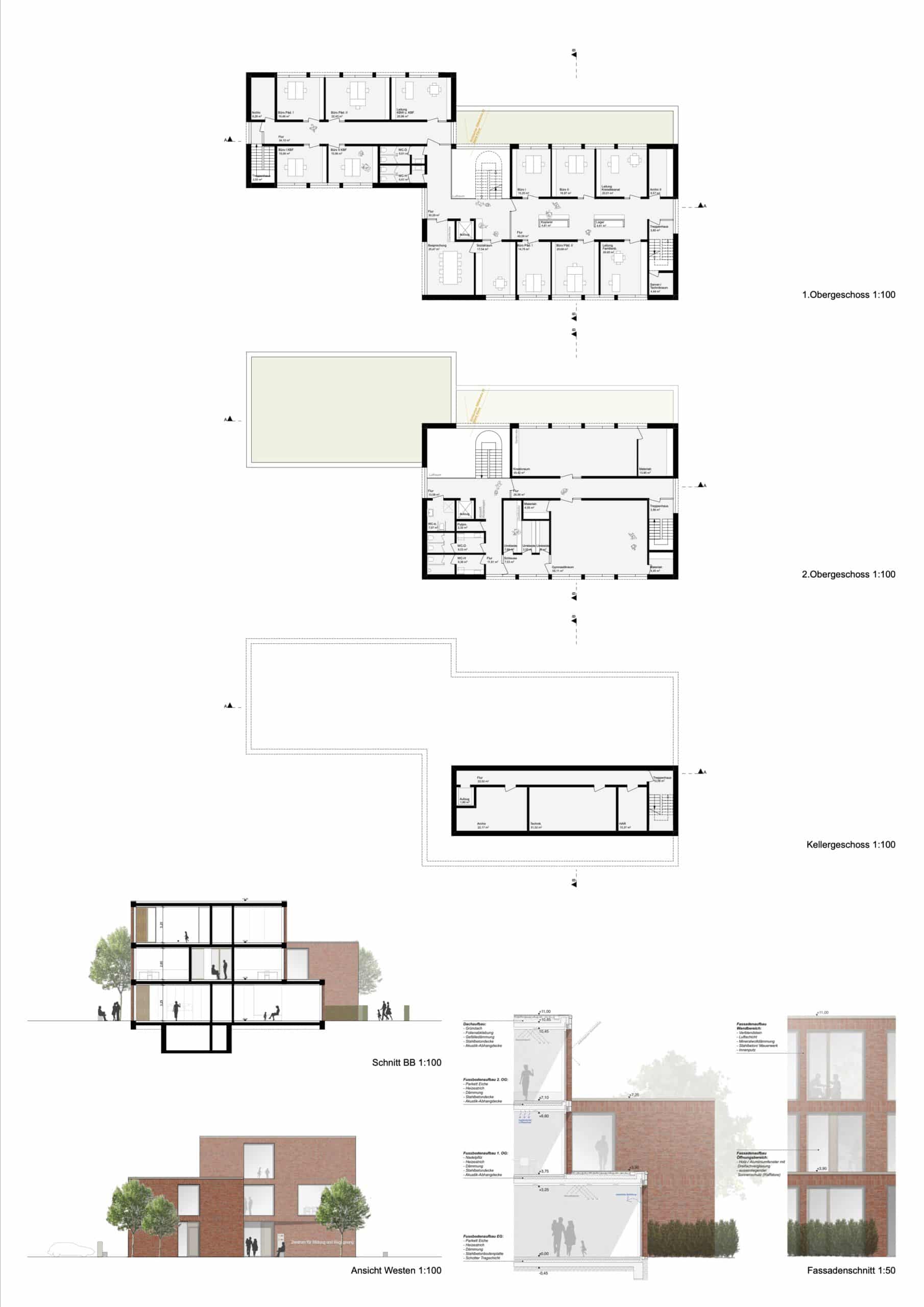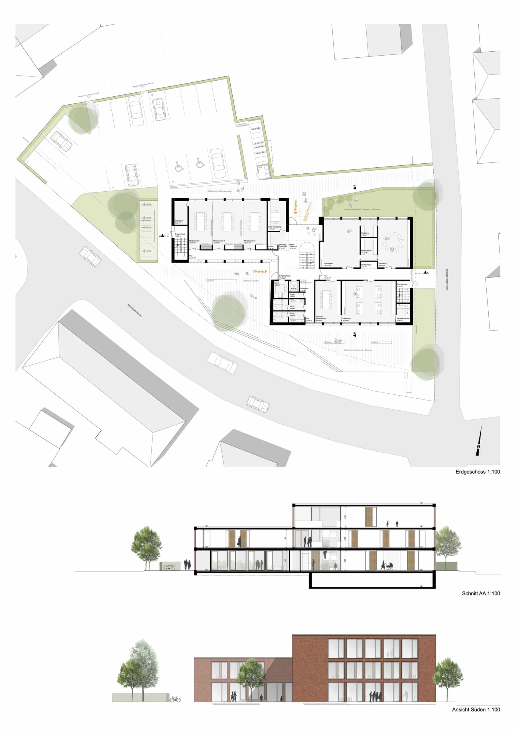 Für die Besucher werden in dem dreigeschossigen Baukörper verschiedene Gruppenräume für ein weitreichendes Kursangebot untergebracht. Diese befinden sich im Erdgeschoss und im 2. Obergeschoss. Die angrenzenden Freiflächen bringen für die Kurs- und Lehrräume im Erdgeschoss ebenfalls eine zusätzliche Aufenthaltsqualität. Im 1. Obergeschoss liegen weitere Räumlichkeiten für die Büronutzung der vier Nutzer. Alle Räumlichkeiten sind über das zentral gelegene Foyer über eine großzügige Freitreppe zu erreichen. Durch die klar gegliederten Baukörper und die zentrale Erschließung wird eine gute Orientierung im Gebäude gewährleistet.