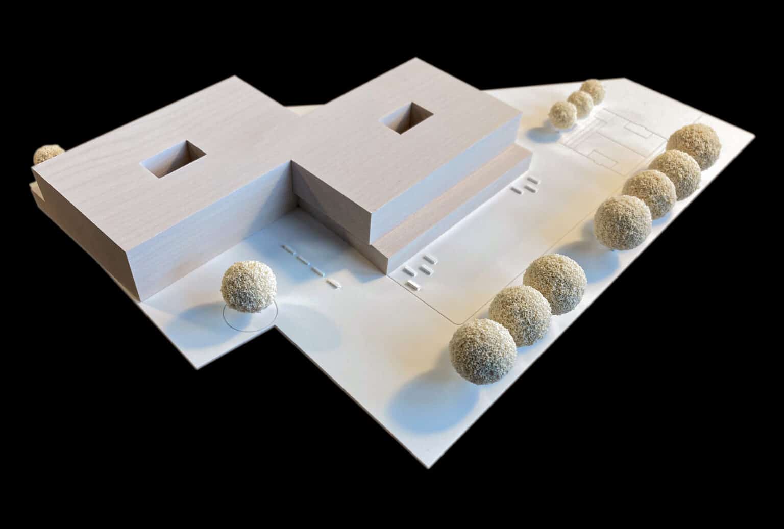 Das Schulgelände gliedert sich künftig in einen nördlichen Bereich für die Grundschule und einen südlichen Bereich für die Gesamtschule, jeweils mit eigenen Außenflächen. Der Neubau der Grundschule liegt im nördlichen, dreieckigen Teil des Geländes. Er besteht aus zwei leicht versetzten Baukörpern, die sich an die Form des Grundstücks anpassen. Gleichzeitig entsteht ein einladender Zugang zur Jahnstraße. Durch die Aufteilung wirkt das Gebäude übersichtlich und fügt sich mit seiner dreigeschossigen Bauweise gut in die Umgebung ein. Die Außenflächen der Grundschule schließen sich im Süden und Südosten an.